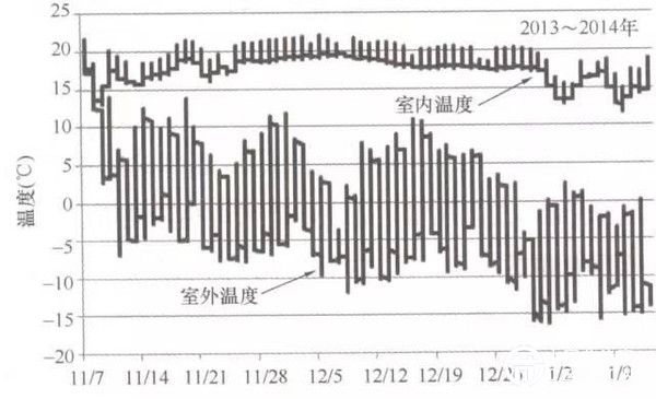 測試方為北京市建委旗下的北京市房地產(chǎn)科學(xué)技術(shù)研究所,測試戶型為167㎡的別墅,此戶型配置的主機型號為HSLR-D-23(S)E,該機組在標(biāo)準(zhǔn)工況下(7℃)時的供熱量為23.8KW,功率為7.26KW。數(shù)據(jù)記錄日期為2013年11月26日—2014年1月13日。測試日期室內(nèi)外溫度變化情況如圖2-1所示。