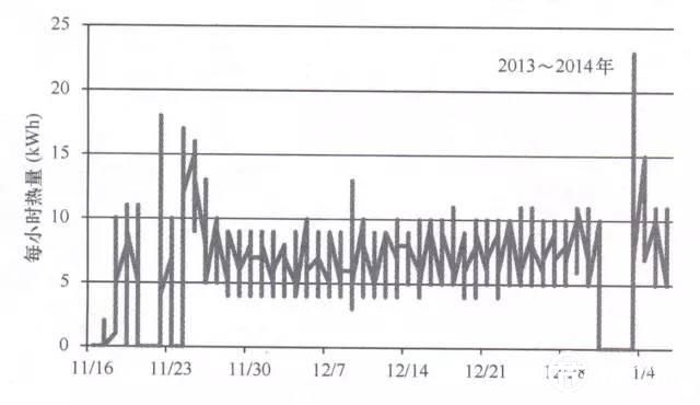 采用的熱量計通過熱量累計功能自動記錄每小時的供熱量,測試期間每小時供熱量如圖2-2所示。