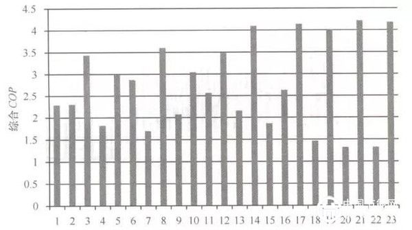 (1)由于采用了空氣源熱泵+輻射地板的方式,用戶供回水溫度降低,提升了熱泵COP,該項目的綜合COP為3.0。