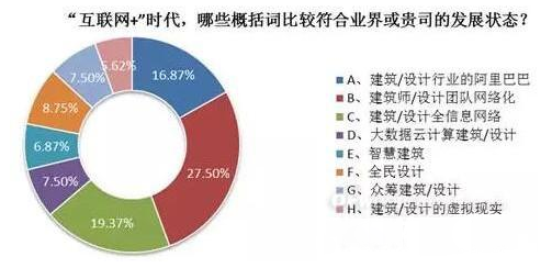 圖一中,有27.5%設(shè)計師表示,互聯(lián)網(wǎng)+時代,“建筑師/設(shè)計團(tuán)隊網(wǎng)絡(luò)化”比較符合業(yè)界和公司目前的發(fā)展?fàn)顟B(tài)。另外19.27%、16.87%的設(shè)計師則分別認(rèn)為,“建筑/設(shè)計全信息網(wǎng)絡(luò)和建筑/設(shè)計行業(yè)的阿里巴巴”符合業(yè)界態(tài)勢。