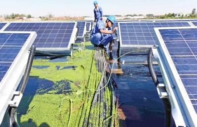 10月10日,電力工人在河北省臨西縣靈溪湖水上光伏發(fā)電場工作。2015年以來,河北省通過市場機制在片區(qū)縣和貧困縣因地制宜開展光伏農(nóng)業(yè)扶貧,利用貧困地區(qū)荒山荒坡、農(nóng)業(yè)大棚或設(shè)施農(nóng)業(yè)等建設(shè)光伏電站,使貧困人口直接增加收入。據(jù)了解,今年河北省的光伏電站建設(shè)總體規(guī)模為120萬千瓦,其中有30萬千瓦專門用于光伏扶貧試點縣的配套光伏電站建設(shè)。