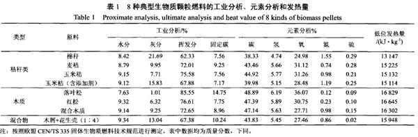 本試驗(yàn)所用生物質(zhì)顆粒燃料均于2009年7月取自北京市大興區(qū)某生物質(zhì)顆粒燃料生產(chǎn)廠,由農(nóng)業(yè)部規(guī)劃設(shè)計(jì)研究院研制的485型生物質(zhì)顆粒燃料成型機(jī)壓制而成。試驗(yàn)選取了8種典型的生物質(zhì)顆粒燃料,包括棉稈、麥秸、玉米秸、玉米秸(含添加劑)4種秸稈類(lèi)顆粒燃料;落葉松、紅松、混合木質(zhì)(榆樹(shù)、柳樹(shù)、楊樹(shù)、桃樹(shù)和紅松的混合物)3種木質(zhì)顆粒燃料;以及1種木質(zhì)與秸稈類(lèi)的混合生物質(zhì)顆粒燃料(木屑與花生殼混合,質(zhì)量比為1:4)。所有顆粒燃料均壓縮加工為圓柱型,直徑8min,長(zhǎng)度10~30rnn],顆粒密度約1.2g/c。8種典型生物質(zhì)顆粒燃料的特性見(jiàn)表1。