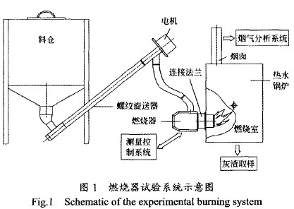 本試驗(yàn)所用的裝置如圖1所示,整個(gè)系統(tǒng)由料倉(cāng)、螺旋輸送器、燃燒器、熱水鍋爐、煙氣分析系統(tǒng)和測(cè)量控制系統(tǒng)等組成。其中,燃燒系統(tǒng)選用從瑞典引進(jìn)的PelleX生物質(zhì)顆粒燃料自動(dòng)燃燒器,熱輸出為10~25kw;燃燒效率約為90%;點(diǎn)火功率消耗約為400w;運(yùn)行時(shí)功率消耗約為40w。該燃燒器的喂料方式為上進(jìn)料式,具有燃燒器與料倉(cāng)分離、回火危險(xiǎn)小、可根據(jù)功率要求保證精確定量進(jìn)料等優(yōu)點(diǎn)。