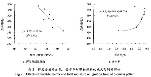 1)生物質(zhì)顆粒燃料所需的點(diǎn)火時(shí)間與燃料的揮發(fā)份、含水率密切相關(guān),揮發(fā)分越高,含水率越低,點(diǎn)火時(shí)間越短。