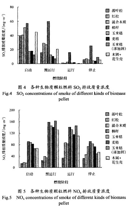 不同生物質(zhì)顆粒燃料的煙氣中SO2、NO排放質(zhì)量濃度如圖4、圖5所示。燃燒器的啟動(dòng)、預(yù)運(yùn)行以及停止階段,SO2排放濃度相對(duì)較高,這是由于不完全燃燒引起的;在運(yùn)行階段,絕大部分生物質(zhì)燃料燃燒時(shí)SO的排放濃度非常低,污染物排放水平較低,基本為零(見(jiàn)圖4),遠(yuǎn)遠(yuǎn)低于GB13271-2001鍋爐大氣污染物排放標(biāo)準(zhǔn)中規(guī)定的900mg/m的指標(biāo)。這主要是由生物質(zhì)中s含量較低所決定的。棉稈則是一個(gè)例外,其SO,排放濃度遠(yuǎn)高于其他生物質(zhì)燃料,S含量與其處于同一數(shù)量級(jí)的其他秸稈類(lèi)燃料的SO2排放濃度則低得多。這說(shuō)明生物質(zhì)燃燒時(shí),其SO生成機(jī)理的復(fù)雜性,不僅與s含量有關(guān),而且與燃料種類(lèi)和設(shè)備等因素有關(guān)。