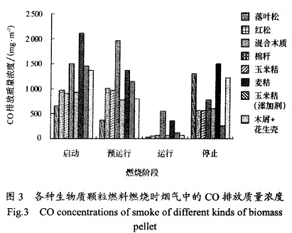 燃燒器正常運(yùn)行時(shí),8種生物質(zhì)顆粒燃料的CO排放質(zhì)量濃度由低到高依次為:落葉松、紅松、玉米秸、木屑+花生殼、玉米秸(含添加劑)、混合木質(zhì)、麥秸、棉稈,其排放質(zhì)量濃度分別為29.18、51.19、59.06、63.09、65.25、120.00、365.94、555.37mg/m。由此可見(jiàn),其中麥秸和棉稈的CO排放質(zhì)量濃度較高,這可能是因?yàn)椴煌镔|(zhì)顆粒燃料的c、H、0元素的含量不同,其所需的理論空氣量也不同,而燃燒器的風(fēng)量是一定的,造成了過(guò)量空氣系數(shù)的不匹配。