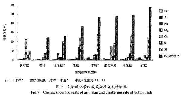生物質(zhì)顆粒燃料的底灰結(jié)渣率與其化學(xué)組成密切相關(guān),見(jiàn)圖7,圖中所示燃料的結(jié)渣率為依次增大。一般來(lái)說(shuō),燃料中Si元素含量越高,結(jié)渣趨勢(shì)越明顯,如木屑+花生殼、玉米秸、紅松、以及麥秸等,其si的質(zhì)量分?jǐn)?shù)基本在25%左右或更高,結(jié)渣率較高;反之,落葉松灰渣中的化學(xué)成分中si的質(zhì)量分?jǐn)?shù)最低,僅為9.76%,其結(jié)渣率也最低(不結(jié)渣)。