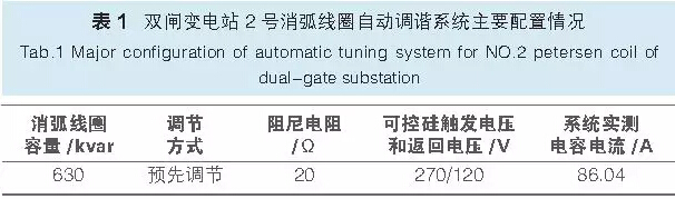 220kV雙閘變電站消弧線圈系統(tǒng)主要配置如表1所示。由表1可知220kV雙閘變電站消弧線圈容量配置不足,已接近補(bǔ)償極限,系統(tǒng)不對(duì)稱電壓正常情況下均在260V左右,可控硅觸發(fā)電壓為270V,系統(tǒng)運(yùn)行方式改變或三相負(fù)荷出現(xiàn)較大變化時(shí)均會(huì)造成系統(tǒng)不對(duì)稱電壓增大,引起可控硅觸發(fā)并短接阻尼電阻。系統(tǒng)出現(xiàn)單相接地故障后由于可控硅返回電壓偏小,阻尼電阻將無(wú)法再次投入,以上兩點(diǎn)可以解釋線路單相接地、恢復(fù)頻發(fā)現(xiàn)象產(chǎn)生的原因。