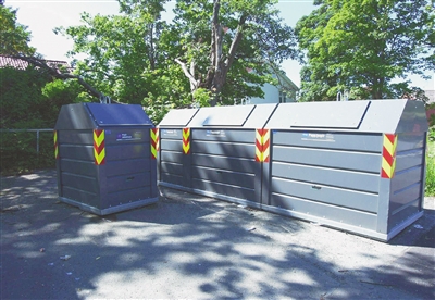 圖為挪威奧斯陸居民區(qū)里的箱式垃圾桶。