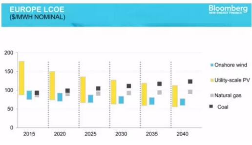 例如,在中國、印度和歐洲,BNEF預測到2020年,光伏發(fā)電的成本將比天然氣更有競爭力。而風電今天已經達到這種水平了。