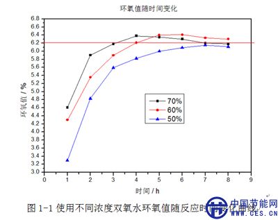 與60% H2O2相比,70%濃度的H2O2不僅反應(yīng)速度更快,而且環(huán)氧值更高,特別是在反應(yīng)時(shí)間3~5h內(nèi),70% H2O2體現(xiàn)出更為突出的優(yōu)勢(環(huán)氧值在6.2~6.38范圍內(nèi),殘余碘值< 5g/100g,產(chǎn)品色度在120~140范圍內(nèi),且產(chǎn)能大幅度提高)。