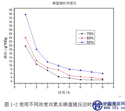 使用高濃度雙氧水替代傳統(tǒng)低濃度雙氧水,不僅可縮短反應(yīng)時(shí)間,提高反應(yīng)速率,而且可獲得更高的環(huán)氧值、更低的碘值。如圖1-1,在同樣的環(huán)氧化工藝中,高濃度(60%,70%)雙氧水的應(yīng)用能在更短的生產(chǎn)周期內(nèi)獲得高環(huán)氧值產(chǎn)品;特別是70%濃度的雙氧水,反應(yīng)在3~4h時(shí)就達(dá)到環(huán)氧峰值6.38/100g,而使用50%濃度雙氧水需要7h才能達(dá)到環(huán)氧峰值6.15/100g。高濃度雙氧水(60%,70%)更能促進(jìn)環(huán)氧反應(yīng)的進(jìn)行,碘值轉(zhuǎn)化率更高;由圖1-2可以看到隨著反應(yīng)時(shí)間的進(jìn)行,碘值逐漸減少,表明雙鍵逐漸打開參與環(huán)氧反應(yīng);縱向比較可以得到,濃度越高碘值下降的越多,其中70%濃度雙氧水效果最明顯,以反應(yīng)6h為例,使用70%雙氧水碘值降到2.9g/110g,而50%雙氧水碘值只能降到7.6 g/110g。