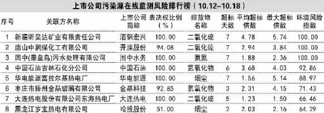 今日發(fā)布的“上市公司污染源在線監(jiān)測風險排行榜”(以下簡稱“環(huán)保榜”)顯示,10月12日至18日的監(jiān)測期內(nèi)共計17家企業(yè)上榜。除新疆昕昊達礦業(yè)有限責任公司仍然固守第一以外。唐山中潤煤化工有限公司和國中(秦皇島)污水處理有限公司分別位列二、三,且三家企業(yè)均為每日超標排放。