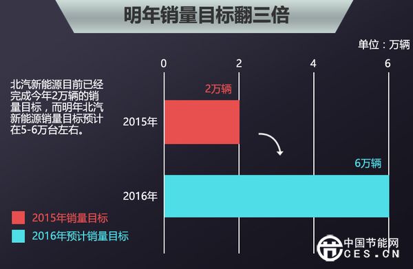 目前北汽新能源在售車型包括E150EV、EV160、EV200、ES210、威旺307EV,在第三季度,北汽新能源獲得訂單超6000輛,2015年前三季度累計(jì)交車達(dá)到11,247輛,比去年同期增長(zhǎng)了11倍之多。通過豐富產(chǎn)品、完善網(wǎng)點(diǎn)布局、建設(shè)專營隊(duì)伍等舉措,北汽新能源目前已經(jīng)完成今年2萬輛的銷量目標(biāo)。明年北汽新能源銷量目標(biāo)預(yù)計(jì)在5-6萬臺(tái)左右,八款新車的陸續(xù)投放,將會(huì)支撐起明年企業(yè)的市場(chǎng)銷量。