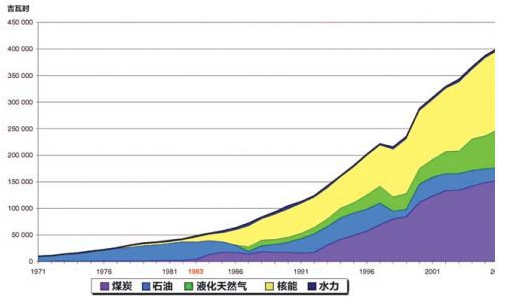 1971~2006年韓國的發(fā)電量及電力結(jié)構(gòu)示意圖