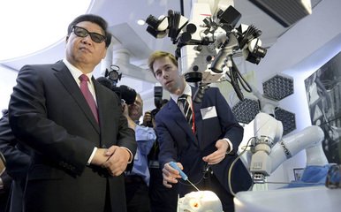在其中一個(gè)參觀的實(shí)驗(yàn)室——做醫(yī)療機(jī)器人研究的哈姆林中心。習(xí)近平和約克公爵帶著3D眼鏡參觀了最新開發(fā)的醫(yī)療機(jī)器人,還和一個(gè)運(yùn)用于外科手術(shù)的庫卡機(jī)器人進(jìn)行互動(dòng)。哈姆林中心所長向習(xí)近平展示了這些更小、更便宜的機(jī)器人如何運(yùn)作,幫助醫(yī)護(hù)工作者以前所未有的精確度做手術(shù)。