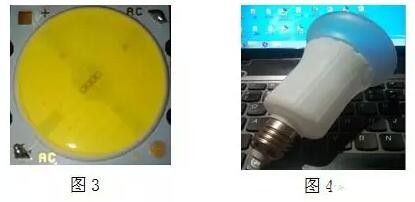 下面是筆者采用HVLED+恒流二極管+鏡面鋁COB封裝試制的一款球泡燈。圖3是HVLED+恒流二極管+鏡面鋁COB封裝的光源,圖4是用該光源組裝的球泡燈。
