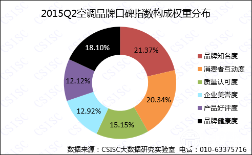 空調(diào)行業(yè)品牌網(wǎng)絡(luò)口碑指數(shù)主要由品牌知名度、消費者互動度、質(zhì)量認可度、企業(yè)美譽度、產(chǎn)品好評度、品牌健康度六個指標組成。比例如下圖所示: