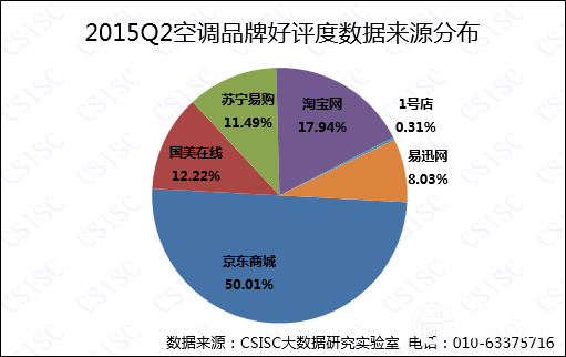 2015年第二季度空調(diào)行業(yè)采集主要品牌產(chǎn)品好評度的數(shù)據(jù)主要來自于淘寶網(wǎng)、京東商城、國美在線、蘇寧易購、易迅網(wǎng)、1號店六大電商平臺。其中,好評度主要分布在京東商城,占總體的50.01%;1號店分布最少,僅0.31%。