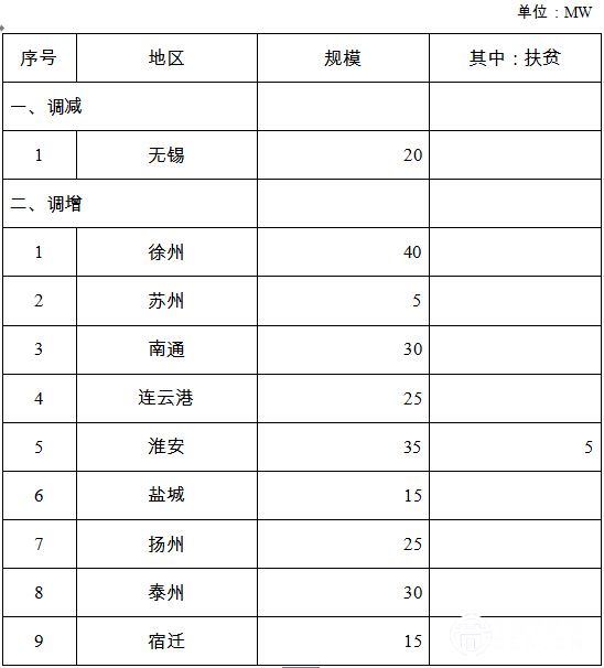 一、本次調(diào)整包括調(diào)減規(guī)模和調(diào)增規(guī)模。同意無(wú)錫市調(diào)減省補(bǔ)規(guī)模2.3MW、調(diào)減年度光伏電站建設(shè)規(guī)模20MW;其調(diào)出的20MW、以及國(guó)家能源局國(guó)能新能〔2015〕356號(hào)文調(diào)增我省的200MW,合計(jì)220MW年度光伏電站建設(shè)規(guī)模,用于調(diào)增徐州等9市年度規(guī)模。具體規(guī)模安排見(jiàn)附件1、2。