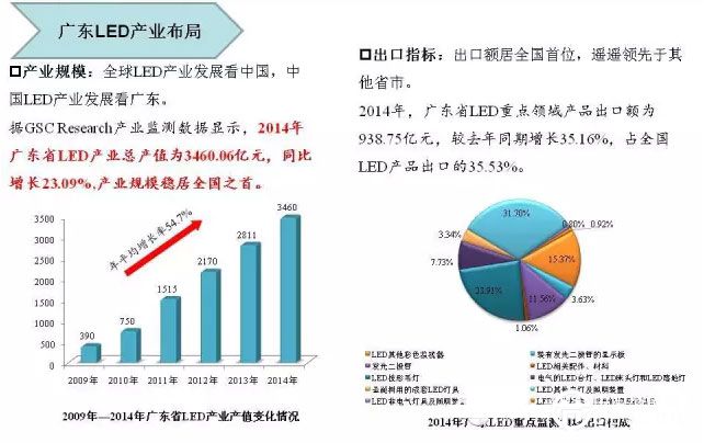 談到了國內(nèi)LED產(chǎn)業(yè)布局時(shí),眭世榮表示,當(dāng)前中國LED產(chǎn)業(yè)已經(jīng)形成了六大片區(qū),當(dāng)中是以珠三角和長三角最為集中。其次還有閩三角地區(qū)——最近江西和福建在這一帶上也實(shí)現(xiàn)較大的突破。根據(jù)GSCResearch的產(chǎn)業(yè)監(jiān)測(cè)數(shù)據(jù)顯示,2014年廣東省LED產(chǎn)業(yè)總產(chǎn)值為3460.06億元,同比增長23.09%,產(chǎn)業(yè)規(guī)模穩(wěn)居全國之首。出口額則居于全國首位,遙遙領(lǐng)先于其他省市。雖然今年總體出口的形勢(shì)有所下滑,但是他認(rèn)為,今年整個(gè)廣東省的出口仍會(huì)在1300億左右。