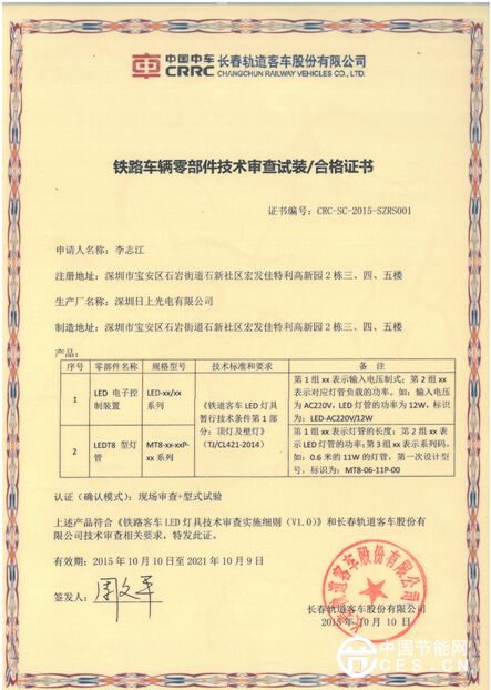 經(jīng)過技術(shù)專家組嚴(yán)格、全面、細(xì)致的核查,審查結(jié)果表明日上光電生產(chǎn)的LED電子控制裝置和LEDT8型燈管在質(zhì)量性能和安全性能方面已符合《鐵路客車LED燈具技術(shù)審查實(shí)施細(xì)則(V1.0)》和長春軌道客車股份有限公司技術(shù)審查的相關(guān)要求,最終確認(rèn)日上光電通過鐵路車輛零部件技術(shù)審查認(rèn)證。
