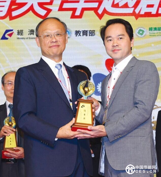 大康織機(jī)公司協(xié)理趙國(guó)華(右)接受經(jīng)濟(jì)部長(zhǎng)鄧振中(左)頒發(fā)節(jié)能優(yōu)等獎(jiǎng)獎(jiǎng)座。圖/業(yè)者提供