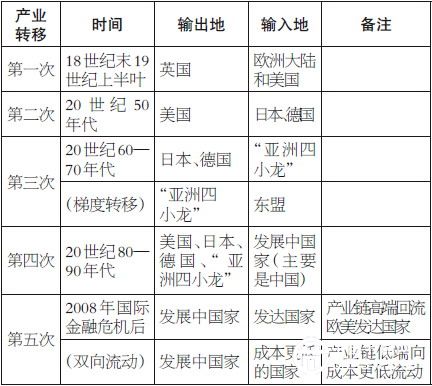 表為工業(yè)革命以來全球五次大的產(chǎn)業(yè)轉(zhuǎn)移