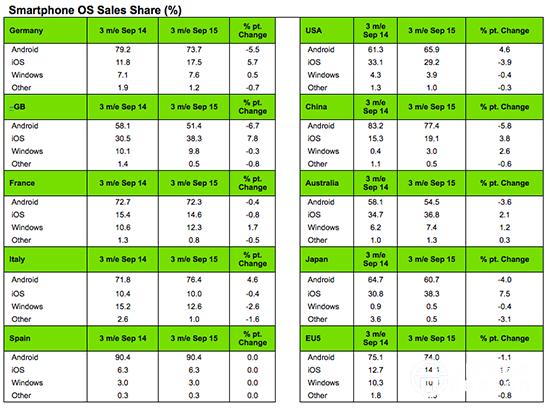 不過,由于蘋果和三星兩大廠商獨占了英國地區(qū)66%的銷量,華為在該地區(qū)的表現(xiàn)平平。據(jù)Kantar給出的信息,在英國地區(qū)iOS設備第三季度市場份額同比去年有較大提升,Android設備市場份額則有所降低。
