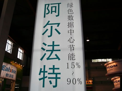 在國(guó)際通信展上,筆者被阿爾法特的廣告所吸引,綠色網(wǎng)絡(luò)、數(shù)據(jù)中心可以節(jié)能15%--90%的電力,這個(gè)力度是否夸張,筆者特意參觀了參展的阿爾法特綠色機(jī)房(Green Internet Data Center),并與現(xiàn)場(chǎng)的技術(shù)員進(jìn)行了討論。阿爾法特(AIRFACT)機(jī)電工業(yè)公司是專門從事網(wǎng)絡(luò)通訊和數(shù)據(jù)中心機(jī)房的廠商,此次參展的綠色機(jī)房占據(jù)了整個(gè)展位超過一半的位置,從圖片我們可以看到,展示用的綠色機(jī)房屬于小型機(jī)房,采用了密閉式設(shè)計(jì),設(shè)計(jì)有兩排,每排有五個(gè)機(jī)柜,足以供一些中型規(guī)模企業(yè)來搭建獨(dú)立的數(shù)據(jù)中心或者網(wǎng)絡(luò)中心。