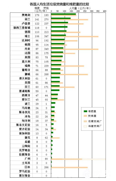 全球起碼有8個國家和地區(qū)生活垃圾填埋量低于人均每年7公斤,有瑞士、德國、荷蘭、瑞典、比利時,垃圾末端處理主要采用焚燒,但通常焚燒率高的國家,都有嚴格的垃圾分類,也就有高的資源回收率,只有日本由于焚燒廚余垃圾,回收率較低。