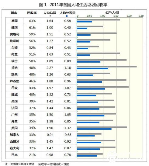 香港由于旅游人口和本地人口的比率比較大,人均處置量較高,但2010年有52%的回收率,2011年雖然只有48%的回收率,總的填埋量還是減少了,有機器回收廢塑料不計入回收比例的原因。因此實際回收率超過52%,也可以列入廢物管理完善類。