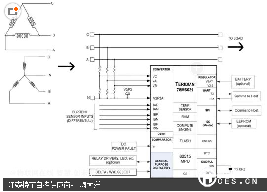 圖2:78條箴言Teridian m6631功率測(cè)量和監(jiān)控SoC不僅實(shí)現(xiàn)智能電表的大部分功能,而且還提供各種線傳感器類型和三相連接配置。