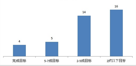從推廣目標(biāo)完成率來看,除去4城市完成外,有5個(gè)城市(江蘇、廣東、廣州、臨沂、北京)完成率達(dá)50%以上,14個(gè)城市完成推廣目標(biāo)的20-50%,16個(gè)城市僅完推廣目標(biāo)的20-50%,16個(gè)城市僅完成推廣目標(biāo)的20%以下。