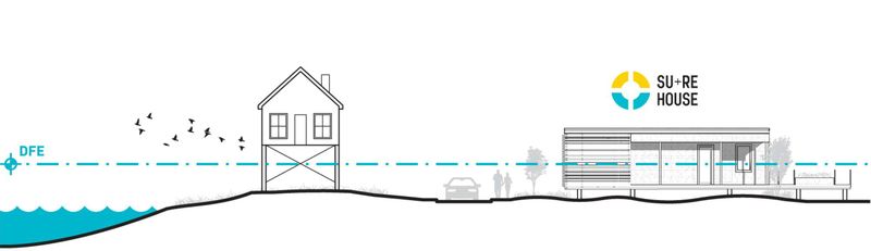 SURE House項(xiàng)目的目標(biāo),是建造一所能面對(duì)北大西洋海岸越來越惡劣的天氣也屹立不倒的房子。它的地基比一般房子略有升高,可以有效應(yīng)對(duì)水深5英尺(1.52米)的洪水天氣;而建筑底部所用的材料完全密封防水的。