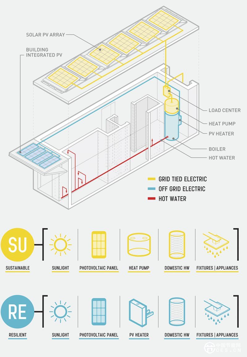 SURE House的屋頂有32個(gè)傳統(tǒng)的太陽能光伏板,它們以網(wǎng)格狀連接,可以在短時(shí)間內(nèi)提供1萬瓦的電量,足夠滿足房間內(nèi)不多的功耗。
