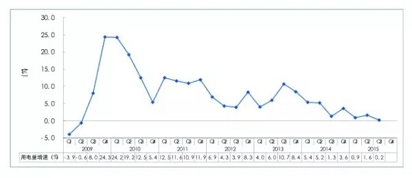 ▲2009年以來(lái)各季度全社會(huì)用電量同比增長(zhǎng)情況