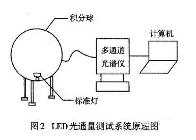 光通量、發(fā)光效率和色溫采用杭州遠方公司生產(chǎn)的STC4000快速光譜儀,測試原理如圖2所示。被測LED采用固定夾具放在積分球中心,LED發(fā)射經(jīng)積分球內(nèi)部白色漫反射層,漫反射一部分光線通過積分球表面的窄通光孔徑光纖傳輸?shù)轿⑿投嗤ǖ拦庾V儀,光譜儀采集的數(shù)據(jù)通過USB接口發(fā)送到計算機進行處理和顯示。光源采用恒流源供電。