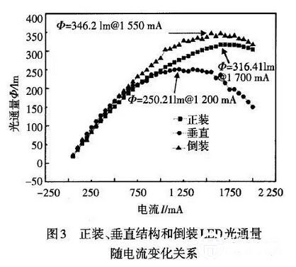 因此,本文對比研究了垂直結(jié)構(gòu)LED和倒裝結(jié)構(gòu)LED隨著電流增大的光輸出變化規(guī)律,并且與普通正裝LED進行了比較,得出了倒裝結(jié)構(gòu)LED具有更好的抗大電流沖擊穩(wěn)定性和光輸出性能。