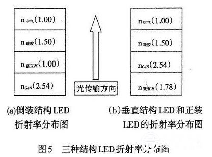 (1)倒裝LED的外量子效率高。三種封裝結(jié)構(gòu)的折射率分布如圖5所示。其中圖5a所示為倒裝封裝結(jié)構(gòu)的折射率分布圖;圖5b所示為垂直封裝結(jié)構(gòu)和正裝封裝結(jié)構(gòu)的折射率分布圖。根據(jù)Snell定律,倒裝LED光從GaN到藍寶石的全反射臨界角θ=sin-1 (n藍寶石/n GaN)=44.5°,藍寶石到封裝硅膠的臨界角為θ=sin-1 (n硅膠/n藍寶石)=57.4°;而垂直結(jié)構(gòu)和正裝LED的光從GaN直接傳輸?shù)椒庋b硅膠層,其全反射臨界角為θ=sin-1 (n硅膠/n GaN)=36.2°,小于倒裝的光傳輸界面的臨界角。較大的臨界角可使更多的光輸出,因此,倒裝結(jié)構(gòu)相較于正裝和垂直結(jié)構(gòu)LED有更高的外量子效率,從而得到了較高的白光發(fā)光效率。