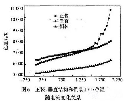 圖6為三種封裝結(jié)構(gòu)LED的電流色溫曲線對比圖。通過實驗測試,隨著驅(qū)動電流的升高,三種封裝結(jié)構(gòu)LED色溫都隨著電流的增加而升高,而倒裝LED的色溫升高斜率最小約為0.40,正裝LED的色溫升高斜率約為0.67,而垂直結(jié)構(gòu)LED在電流小于1 200 mA(光通量飽和點)時色溫增加斜率約為0.84,超過1 200 mA時,色溫參數(shù)接近失效,這與光通量測試和發(fā)光效率測試結(jié)果吻合。倒裝LED的色溫飽和點約為1 600 mA,比垂直結(jié)構(gòu)LED的色溫飽和點高出400 mA。說明倒裝LED在較大電流沖擊情況下,光輸出特性比垂直結(jié)構(gòu)LED穩(wěn)定。