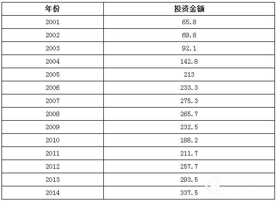 2001-2014年中國中國大氣污染治理投資情況(單位:億元)