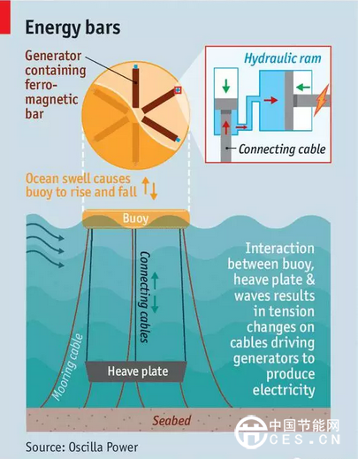 振蕩發(fā)電機有兩個大部件組成,這兩個大部件被纜繩連接在一起。在纜繩的一端,振蕩發(fā)電機漂浮在水面上,在浮標內(nèi)有發(fā)電用的合金棒、磁體、線圈和多套擠壓合金棒的液壓油缸;在纜繩的另一端,吊著一個垂蕩板結(jié)構(gòu),垂蕩板在慣性和周圍海水的拖動下,能保持浮標的穩(wěn)定。這種結(jié)構(gòu)讓浮標在海面隨著海浪上下起伏,而垂蕩板卻大概保持在原來位置,將拉力施加給纜繩。由于拉力的變化,纜繩帶動液壓油缸運轉(zhuǎn)。整套系統(tǒng)由第二套系在海床上的纜繩固定在特定位置上。