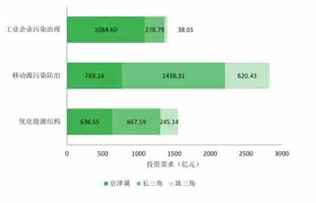 京津冀、長(zhǎng)三角、珠三角三大重點(diǎn)區(qū)域大氣污染防治行動(dòng)計(jì)劃實(shí)施的直接投資分別需要2490.29億元、2384.69億元與903.58億元。其中京津冀所需投資最大的部分是工業(yè)企業(yè)污染治理,長(zhǎng)三角和珠三角所需投資最大的部分是移動(dòng)源污染防治。