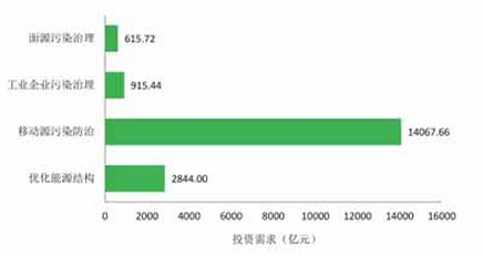 全國(guó)優(yōu)化能源結(jié)構(gòu)、移動(dòng)源污染防治、工業(yè)企業(yè)污染治理、面源污染治理的投資需求分別為2844.00億元、14067.66億元、915.44億元和615.72億元。其中移動(dòng)源污染防治的資金需求最大,是其他三部分之和的三倍還多。