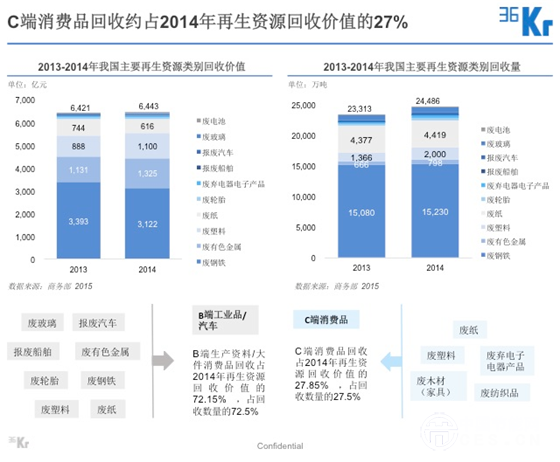 在所有再生資源類別中,C 端消費品可回收資源主要有廢紙、廢塑料、廢棄電子電器產(chǎn)品、廢木材(家具)和廢紡織品等,占所有可再生資源回收總值的 27% 左右。