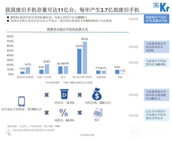 2014 年我國手機出貨量為 4.25 億臺,廢舊手機存量至少達(dá) 11 億臺,每年將誕生 3.7 億臺廢舊手機。當(dāng)前我國廢舊手機回收率僅為 12.5%,閑置約 60%,存量空間巨大。