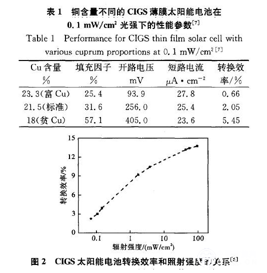 CIGS薄膜太陽能電池不僅在陽光直射下具有較高的轉化效率,其弱光特性也是其他電池所無法比擬的。研究表明,在太陽輻射強度不太理想的地區(qū),CIGS薄膜電池一天或一段時間內的累計發(fā)電量要遠高于其他類電池。圖2為照射光輻射強度對玻璃襯底CIGS薄膜電池轉換效率的影響。標準光強照射條件下光電轉換效率為14%左右,光強降到5mW/cm時,仍有1O%左右的光電轉換效率,當光強進一步降到0.1mW/cm時,效率相應降到3%左右。Virtuan等研究了銅含量不同的CIGS薄膜電池在低輻射強度下的性能參數(shù)情況,結果如表1所示。從表1可以看出,Cu含量的適度降低可以極大提高電池的弱光特性。貧銅含量下,電池轉換效率大約為標準銅含量時的2.6倍,填充因子和開路電壓也有顯著提高。這表明CIGS薄膜電池的弱光性能可以通過銅含量的適度偏離得到極大改善。