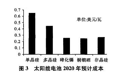 目前CIGS薄膜電池的生產(chǎn)成本在1.2美元/瓦左右,與單晶硅電池相當。隨著研究的不斷深入和生產(chǎn)規(guī)模的進一步擴大,預計成本小于0.3美元/瓦,如圖3所示。技術成熟后,制造成本和能量償還時間均低于硅系電池。