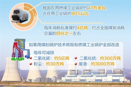 據(jù)初步測(cè)算,如采用煤粉鍋爐技術(shù)將現(xiàn)有燃煤工業(yè)鍋爐全部進(jìn)行改造升級(jí),每年可減排二氧化碳約5億噸、二氧化硫約300萬噸、粉塵約30萬噸、廢渣約3000萬噸,能夠大幅改善我國(guó)的空氣質(zhì)量。